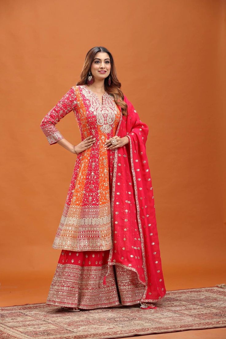 Beautiful Flared Anarkkali set with attractive combination of Cream and orange floral work.